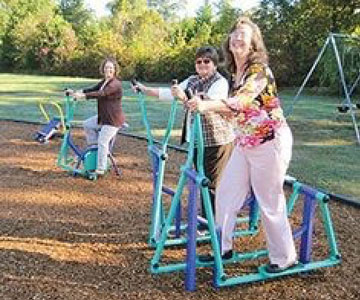 children's playgrounds. For example, you won't find monkey bars, high slides, or jungle gyms, but rather, you'll see equipment that is safer for the joints. A senior citizen playground emphasizes core muscle strength and focuses on activities such as walking, building strength, and increasing flexibility. Some equipment is designed for use by those with limited mobility
