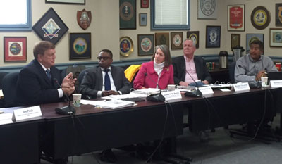 (From left to right) Maryland Governor Larry Hogan, Maryland Secretary of Budget and Management David R. Brinkley, Mayor of Aberdeen Maryland and Maryland Municipal League Legislative Committee Chairman Michael Bennett, Councilman Stewart Cumbo Maryland Municipal League Board of Directors and Representing Southern Maryland Municipal Association as the District Vice President , and Director of Intergovernmental Affairs from the Governor’s Office Geannie Haddaway/Riccio, attending the Maryland Municipal League Legislative Committee Meeting April 2015.